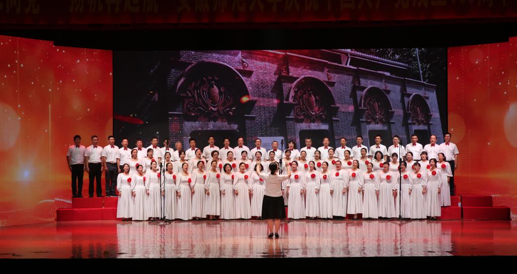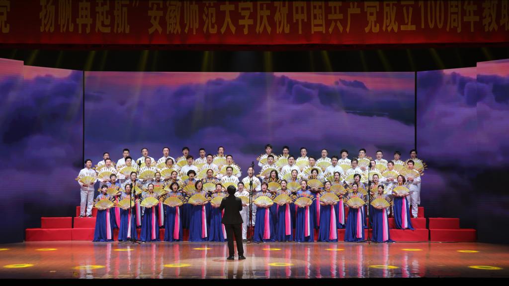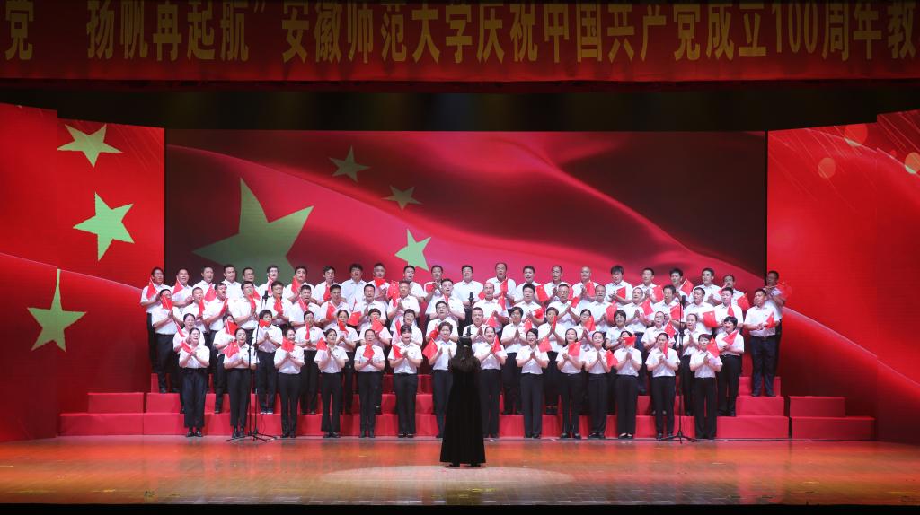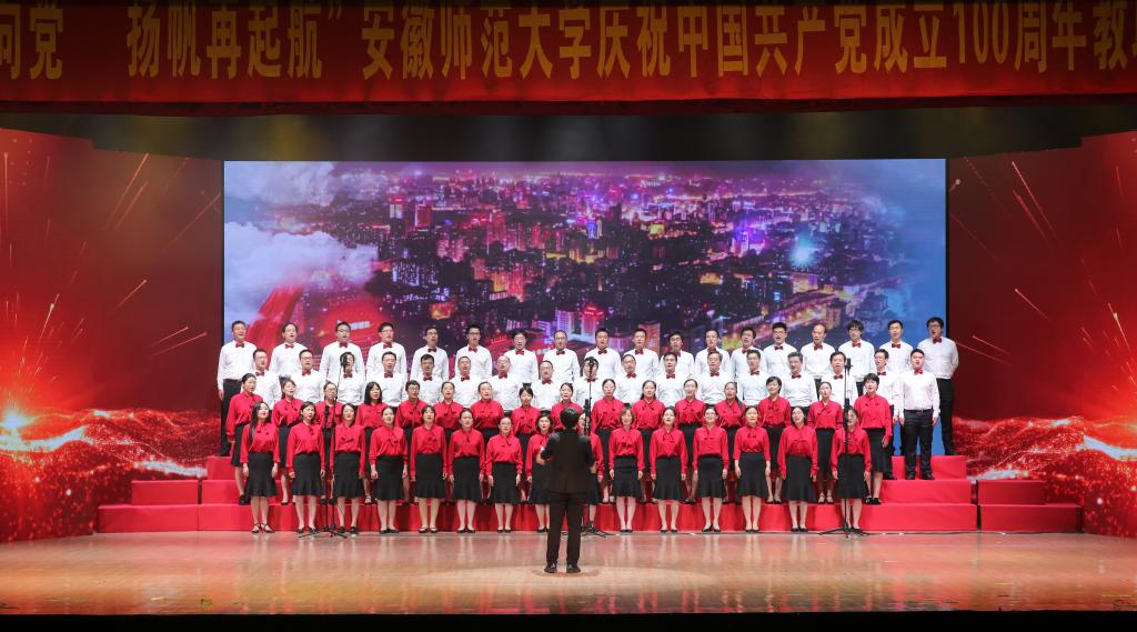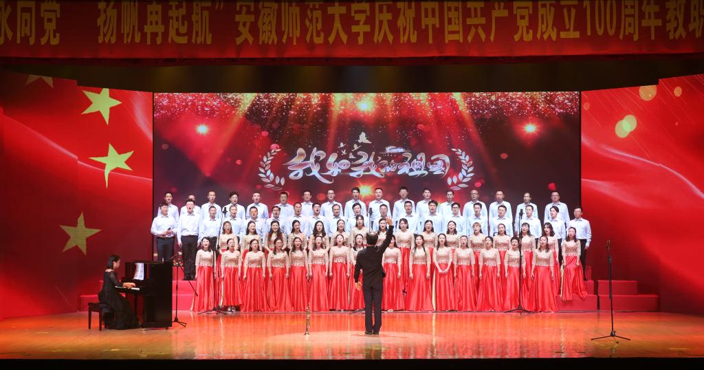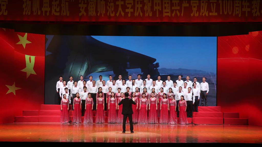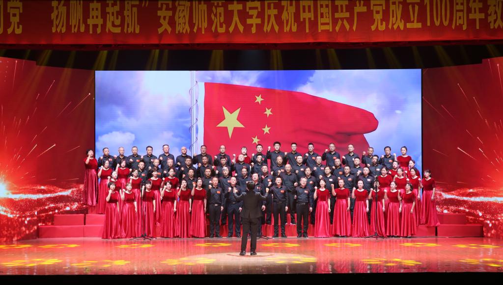 本网讯(党委宣传部 王哲谦)奋斗百年路,踏歌新征程。6月30日下午,安徽师范大学“红心永向党·扬帆再起航”庆祝中国共产党成立100周年教职工合唱展演在花津校区大礼堂举行。全校24支合唱队1500余名教职工放声高歌,回顾党的光辉历史,歌颂英雄人民,歌唱瑰丽山河,尽情抒发对党的忠诚热爱,现场融成一片红歌的海洋,不断汇聚砥砺前行的强大力量。校领导胡朝荣、张庆亮、蒋家平、陆林、彭凤莲、周新发、熊宇杰参加了机关合唱队。