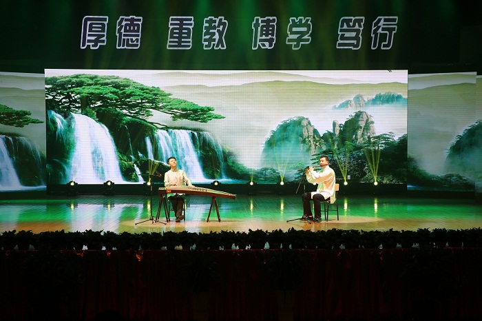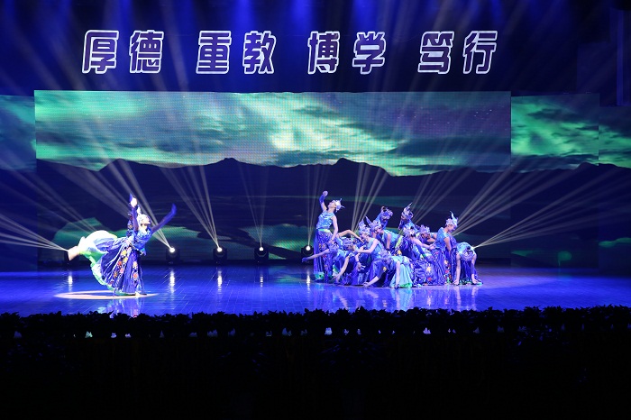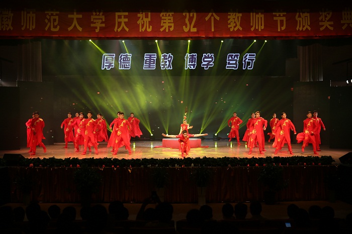 载歌载舞迎佳节,满腔深情颂师恩。整场演出分为四个篇章。参演师生以民乐、舞蹈、歌曲等表演形式,展现了我校教师精诚进取、团结向上的精神风貌,讴歌了他们乐教敬业、无私奉献的崇高师德,表达了师生对师大的良好祝愿。歌曲《长大后我就成了你》,歌颂了教师职业的神圣,道出了师生们的心声,表达了代代相传的育人情怀。舞蹈《红色娘子军》,表现了革命时期中国女性的独特魅力,展现了我校教师团结奋进、共创未来的精神风貌。舞蹈《山泉之恋》展现了我校教师躬耕杏坛、春风化雨、灼灼其华的美好追求。古筝独奏《高山流水》反映了学校教师仁智兼修、志向高远的人生境界。舞蹈《盛世华章》表达了全校学生对全体教师的真情讴歌、深深祝福以及对学校办学发展的良好祝愿。