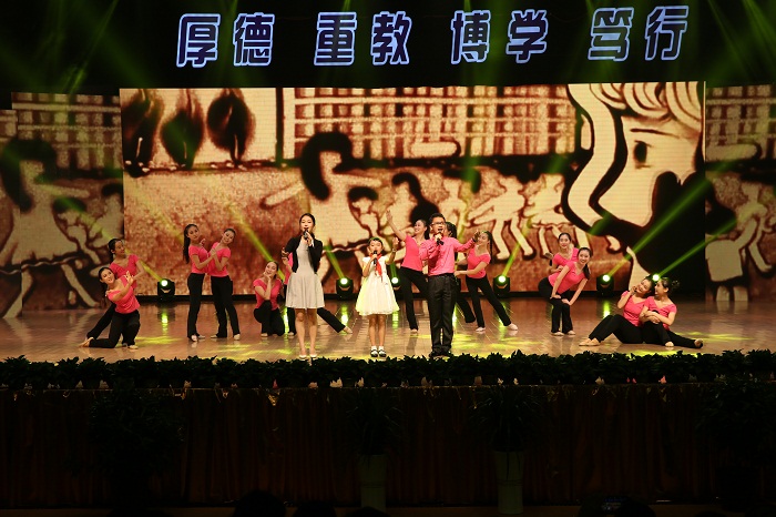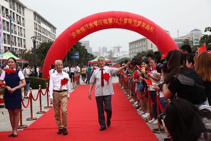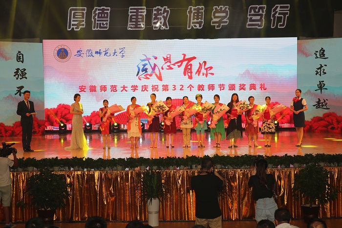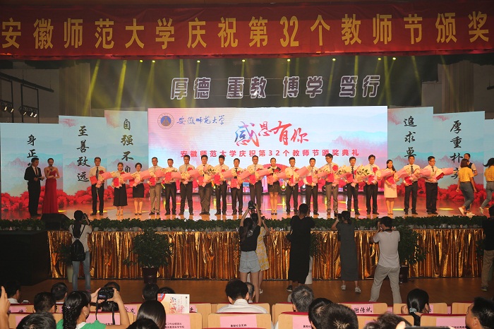 据悉,学校在教师节举办隆重的颁奖典礼,表彰教学科研、管理服务、学生工作等方面的先进集体和个人,让获奖老师们走上红地毯,站上领奖台,享受鲜花和掌声,感受太阳下最光辉的职业应有的崇高和尊严,旨在确立注重教师、注重教学、注重质量的价值导向,号召全体师生员工始终秉承和践行“厚德、重教、博学、笃行”的校训和“厚重朴实、至善致远、追求卓越、自强不息”的师大精神,做有理想信念、有道德情操、有扎实知识、有仁爱之心”的“四有”好老师。