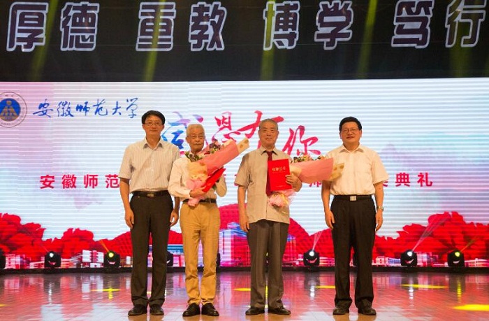 校党委书记顾家山、校长王伦为2016年安徽师范大学终身成就奖获得者刘学锴、陆同兴颁奖