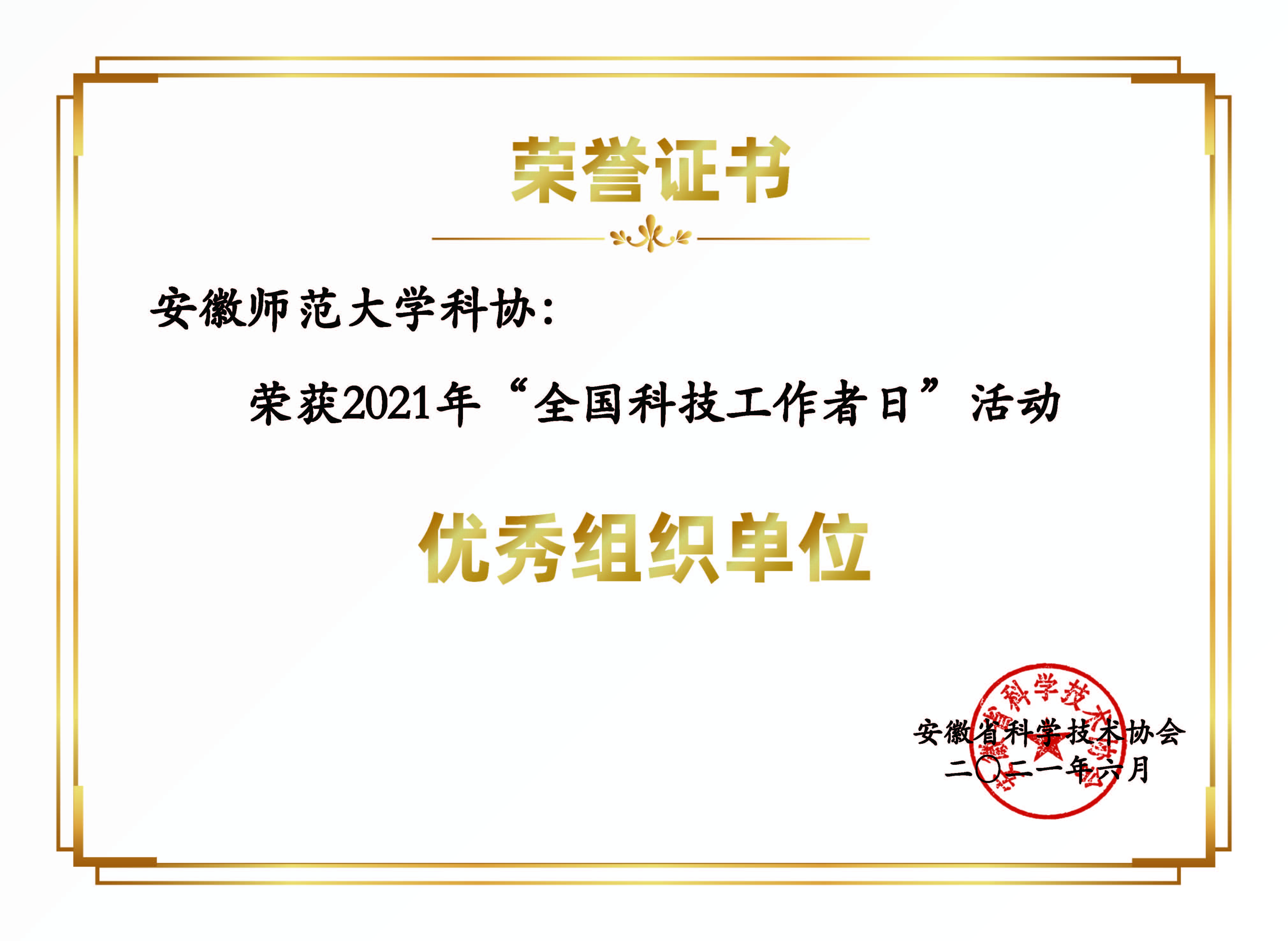 本网讯(校科协)近日,安徽省科学技术协会发布了关于表扬2021年“全国科技工作者日”活动优秀组织单位的通知,我校科学技术协会荣获优秀组织单位奖。全省共有10个单位科协获此荣誉,我校是本科高校科协中唯一获奖单位。