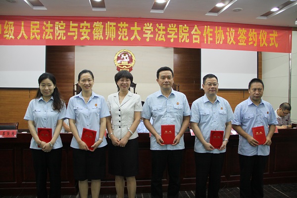 仪式上,胡敏被聘任为安徽师范大学法学院客座教授,丁必勇等5名审判实务专家被聘任为法律硕士合作导师。