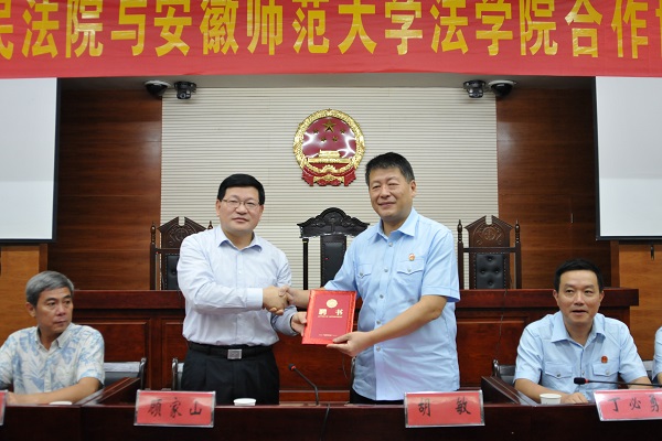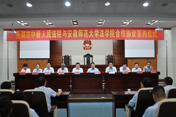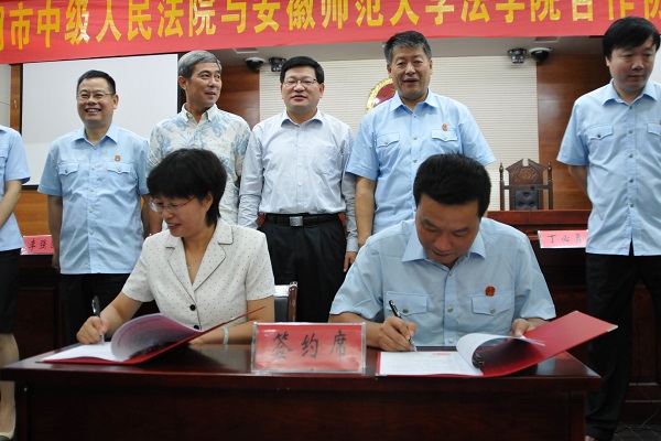 法学院院长彭凤莲与芜湖市中级人民法院党组副书记、副院长丁必勇签署了合作协议。双方本着互相协作、优势互补、资源共享、共同促进“法治芜湖”建设的原则,就继续推进“芜湖市中级人民法院法官培训教育基地”和“安徽师范大学法学院教学实践基地”建设、继续加强芜湖中院在我校设立的第十六法庭(示范庭)的建设及共享优质资源、共同培养法学人才等工作,开展深入合作。