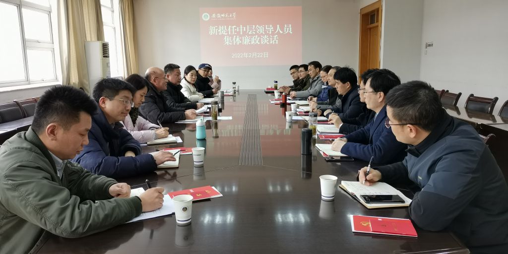 近日,学校对新提任中层领导人员进行集体廉政谈话。校党委常委、纪委书记、监察专员周新发出席会议并讲话,纪委办、组织部相关负责同志、2022年新提任及进一步使用中层领导人员参加会议。会议由校纪委副书记、纪委办主任吴春雷主持。
