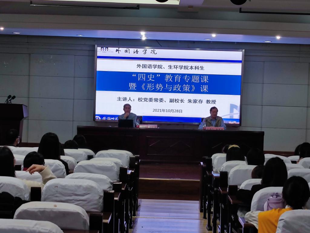 本网讯(外国语学院 赵华杰)10月28日下午,校党委常委、副校长朱家存为学生上“四史”教育专题课暨《形势与政策》课。外国语学院和生环学院学生现场听课。外国语学院党委书记余国升主持。
