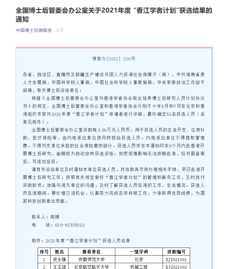 据了解,“香江学者计划”于2010年12月启动,由国家人力资源和社会保障部全国博士后管委会办公室与香港学者协会联合实施,旨在将内地的人才资源与香港的研究资源紧密结合,为内地培养具有全球视野的战略型高端人才,同时推动香港科技发展。该计划每年选派内地优秀博士到香港指定的大学,在港方合作导师的指导下,以港方大学合约研究人员的身份开展为期2年的博士后研究。该计划主要面向年龄不超过35周岁的应届博士毕业生、在站博士后研究人员或在职教学、科研人员。遴选程序为个人提出申请,单位审核、推荐,全国博士后管委会办公室和香港学者协会分别组织评审。全国博士后管委会办公室资助每人36万元,可用于获选人员的生活开支、住房补助、医疗保险等,由内地派出单位按月转拨给获选人员。