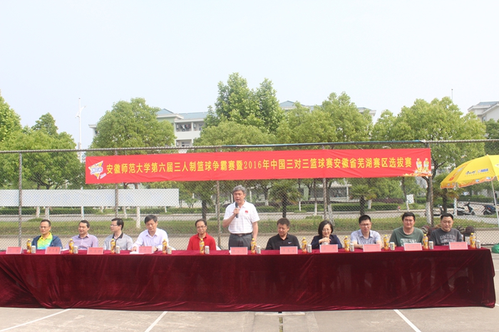 本网讯(体育学院 文/蔡维敏 图/左宗玲)5月14日上午,安徽师范大学第六届三人篮球赛暨中国CBA三对三篮球赛芜湖赛区比赛在安徽师范大学南侧体育馆室外篮球场火热开幕。副校长朱家存教授、校团委书记梁燕、校学生处副处长张玉新、体育学院全体领导班子成员及相关专业负责人、大赛技术代表何也明老师、大赛裁判长蔡维敏等出席了开幕式。