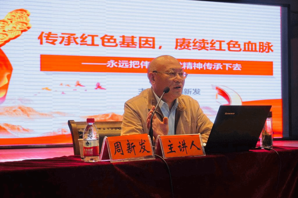 周新发以“传承红色基因,赓续红色血脉”为主题,结合自身的学习和体会阐述了伟大建党精神的理论来源及实践基础、文化土壤、深刻内涵,强调伟大建党精神是中国共产党人精神谱系的“源头活水”、“一根红线”和鲜亮底色。周新发指出,新时代的青年大学生传承伟大建党精神,要筑牢“一心向党”的政治忠诚,要坚定“一诺千金”的理想信念,要厚植“一叶知秋”的为民情怀,要强化“一马当先”的责任担当,要增强“一决胜负”的斗争本领,要永葆“一往无前”的奋斗姿态,要锤炼“一身正气”的品德修为。