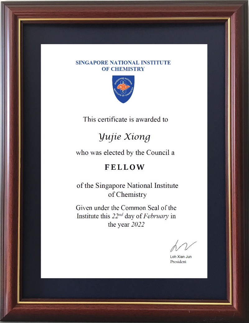 近日,校党委常委、副校长熊宇杰收到新加坡国家化学会(Singapore National Institute of Chemistry,SNIC)颁发的证书,当选新加坡国家化学会会士(Fellow of the Singapore National Institute of Chemistry,FSNIC)。