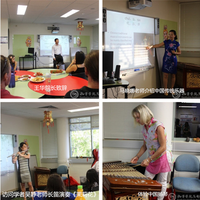 一个半小时的活动中,学员在老师的带领下认识了十二种传统乐器,了解了不同的弹奏方法,欣赏了各具特色的乐器演奏。清脆悦耳的竹笛,如泣如诉的二胡,悠远空灵的古琴……学员们沉醉在中国传统乐器的世界里。来自安徽师范大学音乐学院的访问学者吴静老师一曲长笛独奏《茉莉花》更是让大家赞不绝口。最后,来自查尔斯达尔文大学数理学院的Peter Shaw教授为大家带来了大提琴演奏。