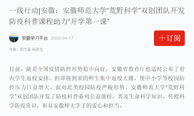 目前,随着全国疫情防控形势稳中向好,安徽省教育厅也适时公布了省内学生返校安排,但即将到来的师生集中返校大潮,使中小学等校园防控压力日益增大。面对此类校园防疫严峻形势,安徽师范大学“荒野科学”双创团队开发了防疫科普系列公益课程,普及生命科学知识、传授科学防疫常识,彰显安徽师大学子的爱心和担当。
