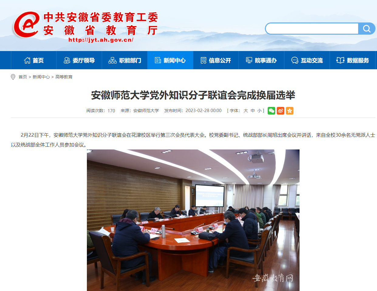 2月22日下午,安徽师范大学党外知识分子联谊会在花津校区举行第三次会员代表大会。校党委副书记、统战部部长周旭出席会议并讲话,来自全校30余名无党派人士以及统战部全体工作人员参加会议。