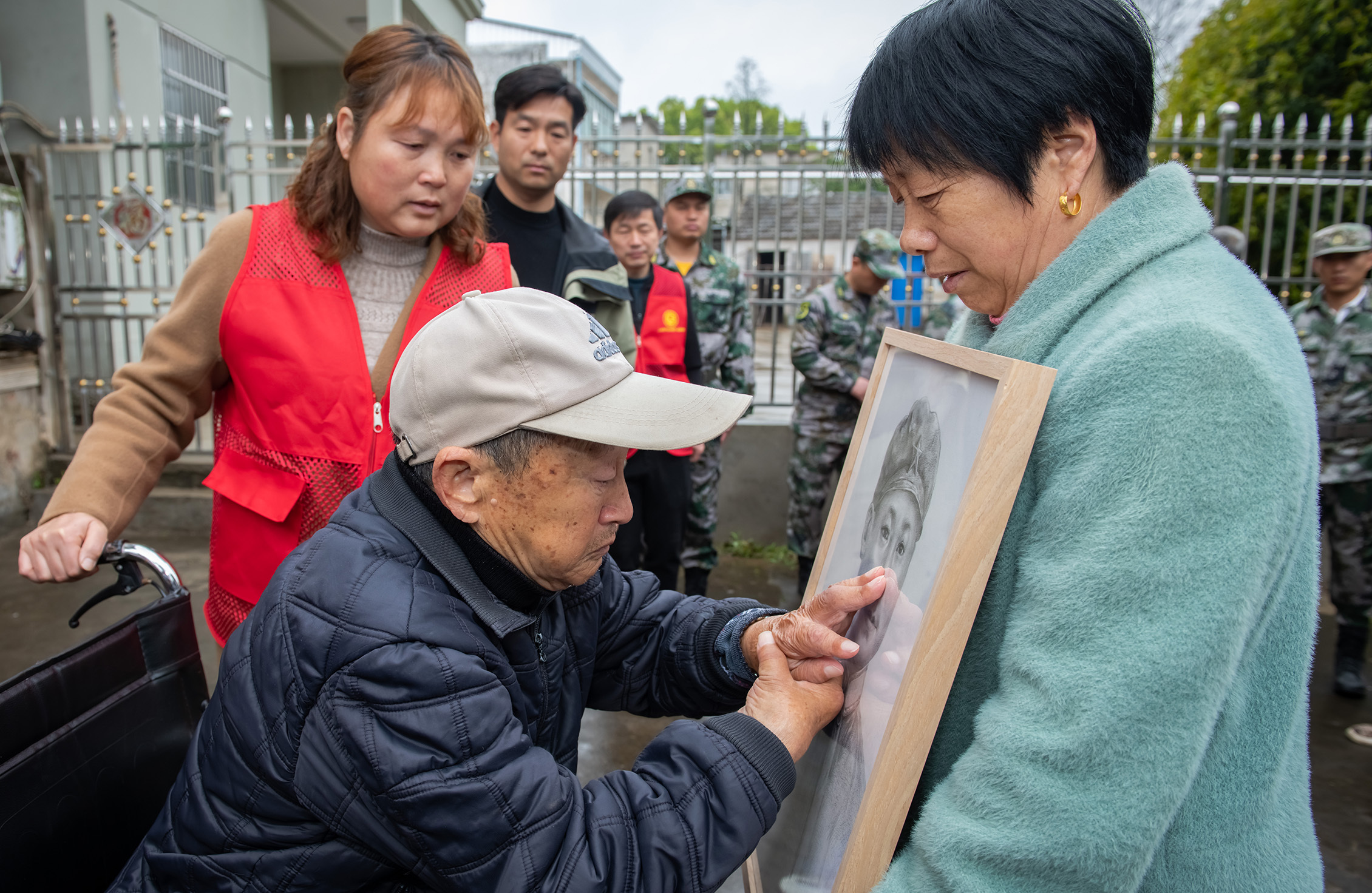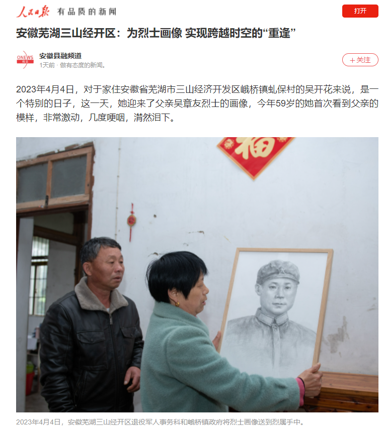 2023年4月4日,安徽芜湖三山经开区退役军人事务科和峨桥镇政府将烈士画像送到烈属手中。