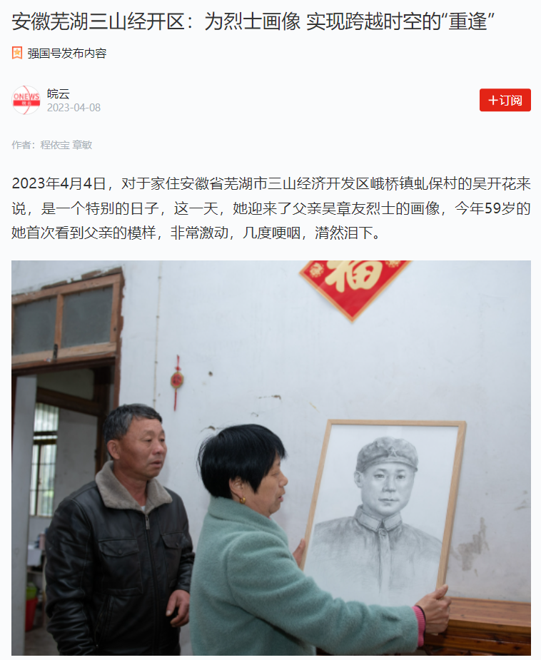 2023年4月4日,安徽芜湖三山经开区退役军人事务科和峨桥镇政府将烈士画像送到烈属手中。