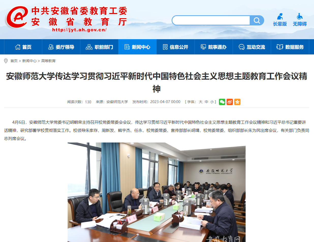 4月6日,安徽师范大学党委书记胡朝荣主持召开校党委常委会会议,传达学习贯彻习近平新时代中国特色社会主义思想主题教育工作会议精神和习近平总书记重要讲话精神,研究部署学校贯彻落实工作。校领导朱家存、周新发、熊宇杰、任永,校党委常委、宣传部部长胡靖,校党委常委、组织部部长朱为民出席会议,有关部门负责同志列席会议。