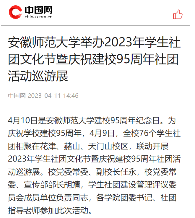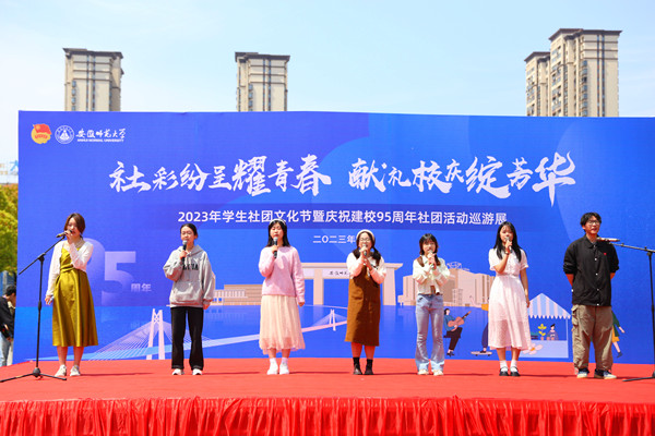 4月10日是安徽师范大学建校95周年纪念日。为庆祝学校建校95周年,4月9日,全校76个学生社团相聚在花津、赭山、天门山校区,联动开展2023年学生社团文化节暨庆祝建校95周年社团活动巡游展。校党委常委、副校长任永,校党委常委、宣传部部长胡靖,学生社团建设管理评议委员会成员单位负责同志,各学院团委书记、社团指导老师参加此次活动。