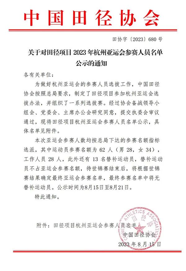 8月15日,中国田径协会官网公示2023年杭州亚运会田径项目参赛名单。其中,安徽4名运动员榜上有名,分别是: