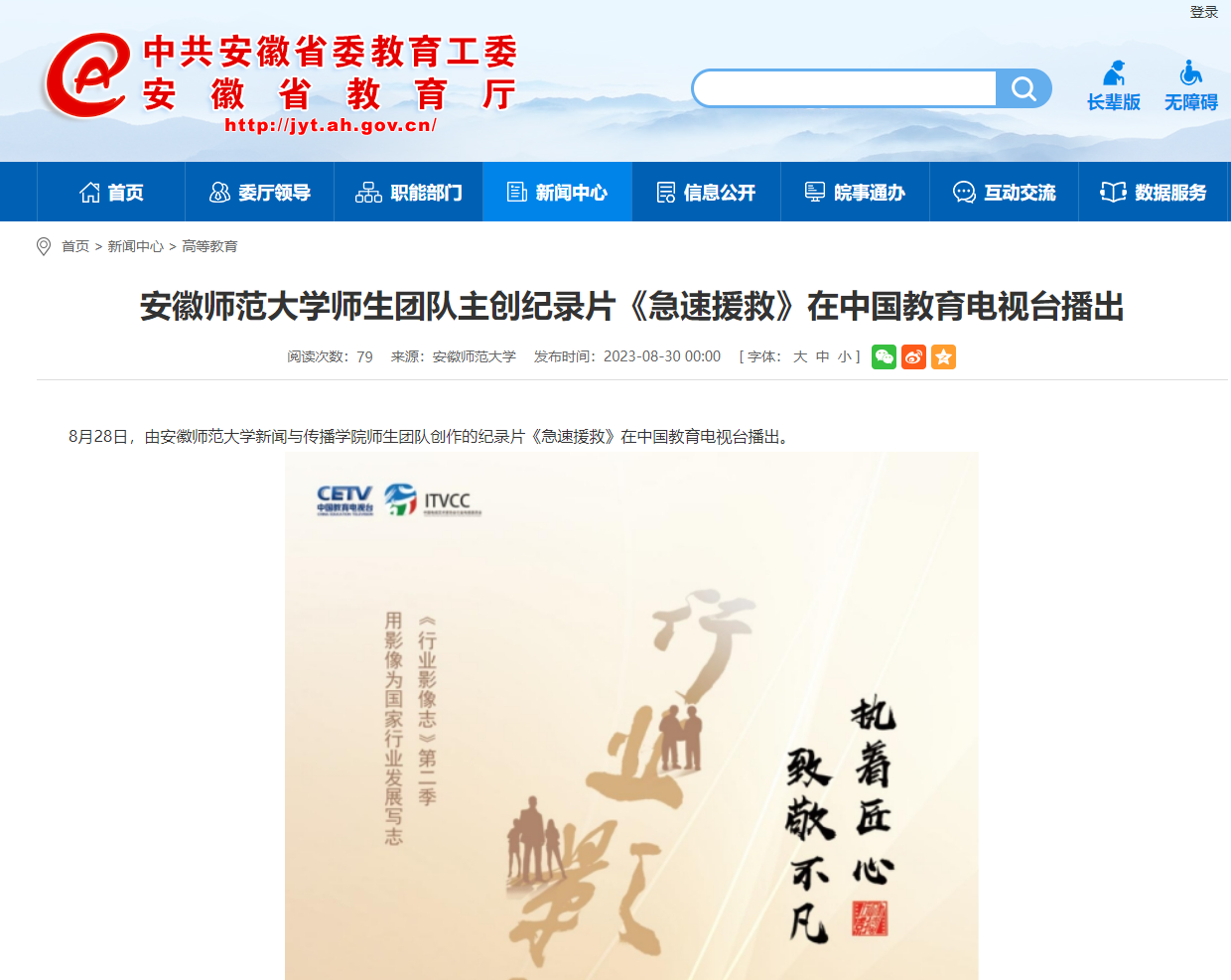 8月28日,由安徽师范大学新闻与传播学院师生团队创作的纪录片《急速援救》在中国教育电视台播出。