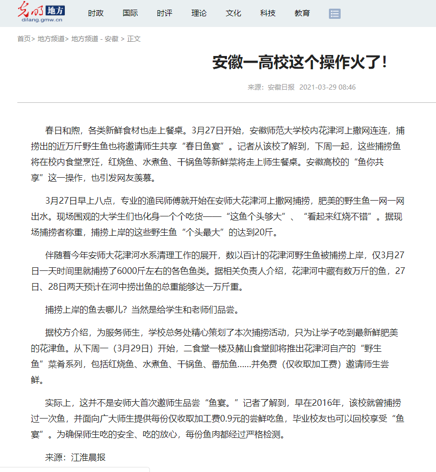 春日和煦,各类新鲜食材也走上餐桌。3月27日开始,安徽师范大学校内花津河上撒网连连,捕捞出的近万斤野生鱼也将邀请师生共享“春日鱼宴”。记者从该校了解到,下周一起,这些捕捞鱼将在校内食堂烹饪,红烧鱼、水煮鱼、干锅鱼等新鲜菜将走上师生餐桌。安徽高校的“鱼你共享”这一操作,也引发网友羡慕。