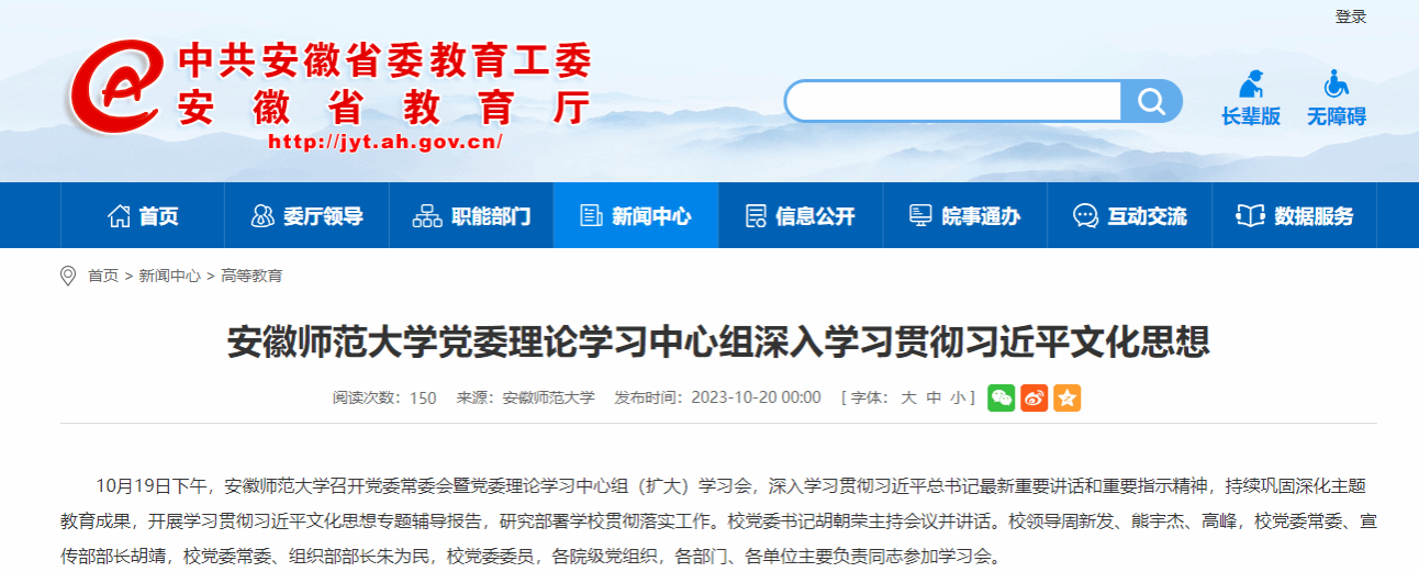 10月19日下午,安徽师范大学召开党委常委会暨党委理论学习中心组(扩大)学习会,深入学习贯彻习近平总书记最新重要讲话和重要指示精神,持续巩固深化主题教育成果,开展学习贯彻习近平文化思想专题辅导报告,研究部署学校贯彻落实工作。校党委书记胡朝荣主持会议并讲话。校领导周新发、熊宇杰、高峰,校党委常委、宣传部部长胡靖,校党委常委、组织部部长朱为民,校党委委员,各院级党组织,各部门、各单位主要负责同志参加学习会。