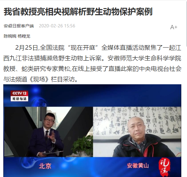 2月25日,全国法院“现在开庭”全媒体直播活动聚焦了一起江西九江非法猎捕濒危野生动物上诉案。安徽师范大学生命科学学院教授、蛇类研究专家黄松,在线上接受了直播此案的中央电视台社会与法频道《现场》栏目采访。