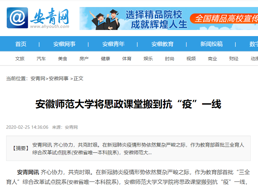 齐心协力,共克时艰。在新冠肺炎疫情形势依然复杂严峻之际,作为教育部首批“三全育人”综合改革试点院系(安徽省唯一本科院系),安徽师范大学文学院将思政课堂搬到抗“疫”一线,引导青年大学生立足自身,尽己所能为战“疫”贡献热血青春,用行动践行“三全育人”的理念。