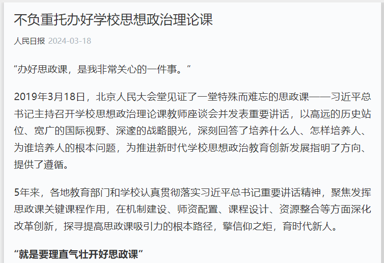 从主持召开学校思想政治理论课教师座谈会,到给江苏省淮安市新安小学少先队员回信,再到观摩中国人民大学思政课智慧教室现场教学,习近平总书记着眼建设教育强国、办好人民满意的教育的深刻思考,站在培养担当民族复兴大任的时代新人的战略高度,明确指出办好思政课的重大意义。