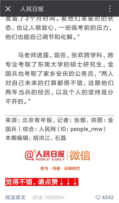 马老师透露,现在,张欢跨学科、跨专业考取了东南大学的硕士研究生,金国兵也考取了家乡安庆的公务员,“两人对自己未来的打算都很不错,这跟他们两年当兵的经历,以及个人的坚持是分不开的。”