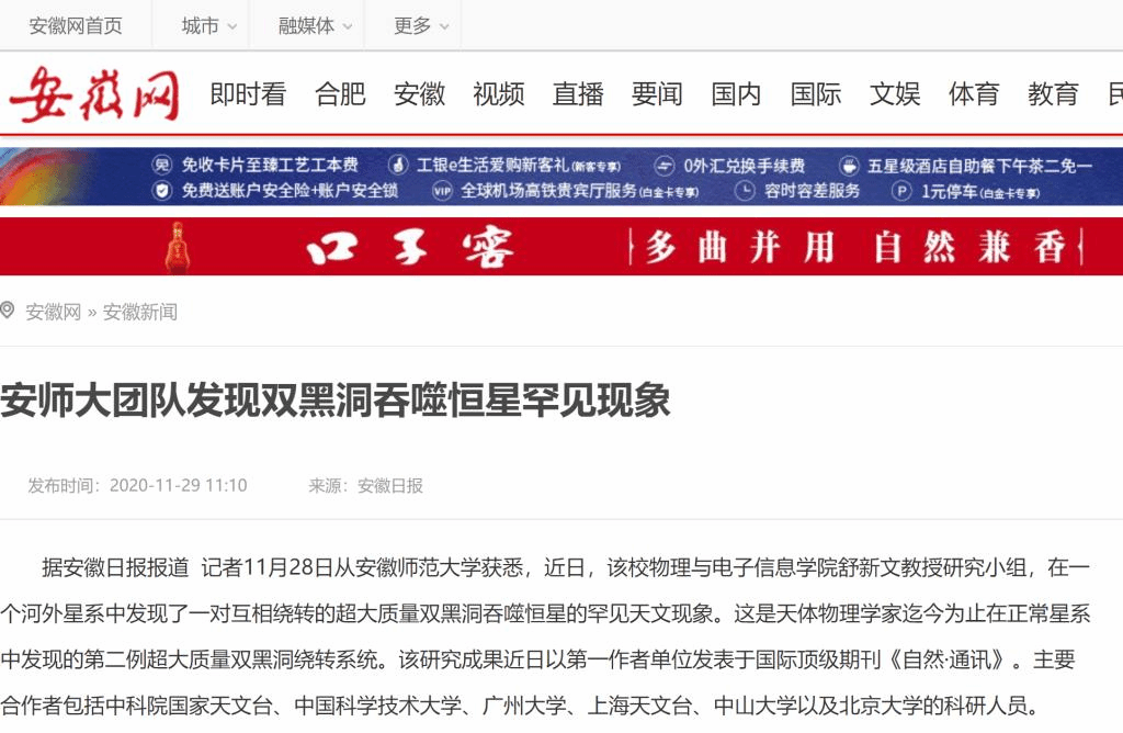 据安徽日报报道 记者11月28日从安徽师范大学获悉,近日,该校物理与电子信息学院舒新文教授研究小组,在一个河外星系中发现了一对互相绕转的超大质量双黑洞吞噬恒星的罕见天文现象。这是天体物理学家迄今为止在正常星系中发现的第二例超大质量双黑洞绕转系统。该研究成果近日以第一作者单位发表于国际顶级期刊《自然·通讯》。主要合作者包括中科院国家天文台、中国科学技术大学、广州大学、上海天文台、中山大学以及北京大学的科研人员。