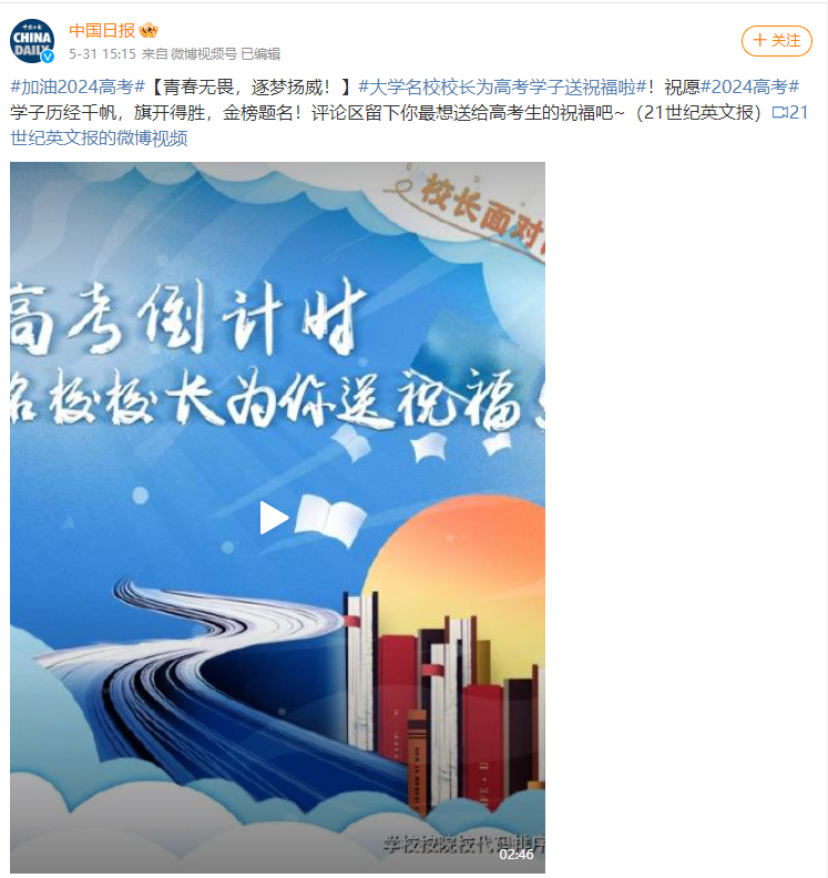 【中国日报官博】】大学名校校长为高考学子送祝福啦!