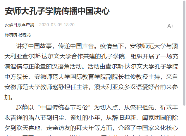 讲好中国故事,传递中国声音。疫情当下,安徽师范大学与澳大利亚查尔斯·达尔文大学合作共建的孔子学院,组织开展了一场充满温情与正能量的汉语角活动。活动由查尔斯·达尔文大学孔子学院中方院长、安徽师范大学国际教育学院副院长杜俊教授主持,来自安徽师范大学教师赵静担任主讲,澳大利亚众多汉语爱好者前来参加。