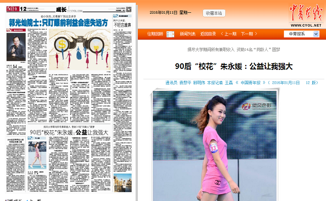 在模特圈里,只有她把兼职所获的收入全都捐出去,还要经常自己搭钱打车、化妆,让人十分不解。“兼职做模特,捐款做公益,这两件事都是我喜欢的,一下子可以做两件事,是一件很幸福的事。”说这话时,朱永媛纯真得像个孩子。