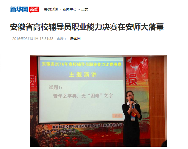 近日,由中共安徽省委教育工委主办,安徽省高校思想政治教育研究会辅导员工作研究分会、教育部高校辅导员培训和研修基地(安徽师范大学)承办的安徽省2016年高校辅导员职业能力比赛决赛成功举办。