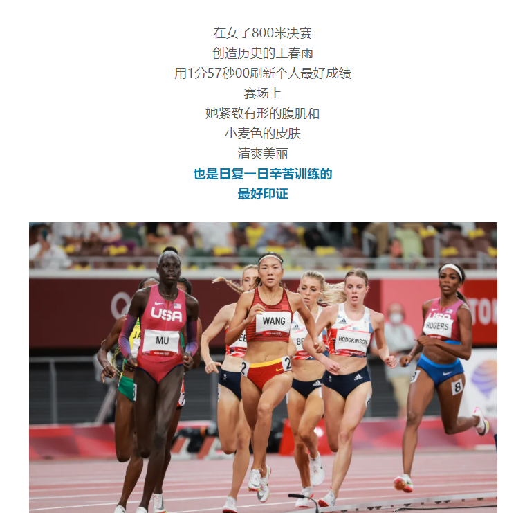 在女子800米决赛创造历史的王春雨用1分57秒00刷新个人最好成绩赛场上她紧致有形的腹肌和小麦色的皮肤清爽美丽也是日复一日辛苦训练的最好印证