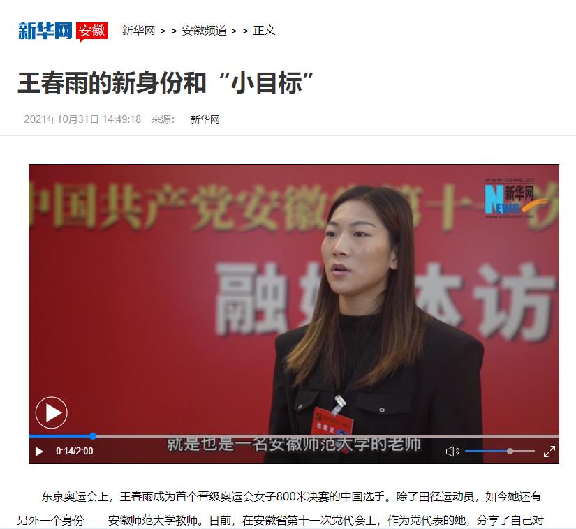 东京奥运会上,王春雨成为首个晋级奥运会女子800米决赛的中国选手。除了田径运动员,如今她还有另外一个身份——安徽师范大学教师。日前,在安徽省第十一次党代会上,作为党代表的她,分享了自己对于新身份的认识和感受,也透露了接下来征战杭州亚运会和巴黎奥运会的“小目标”。