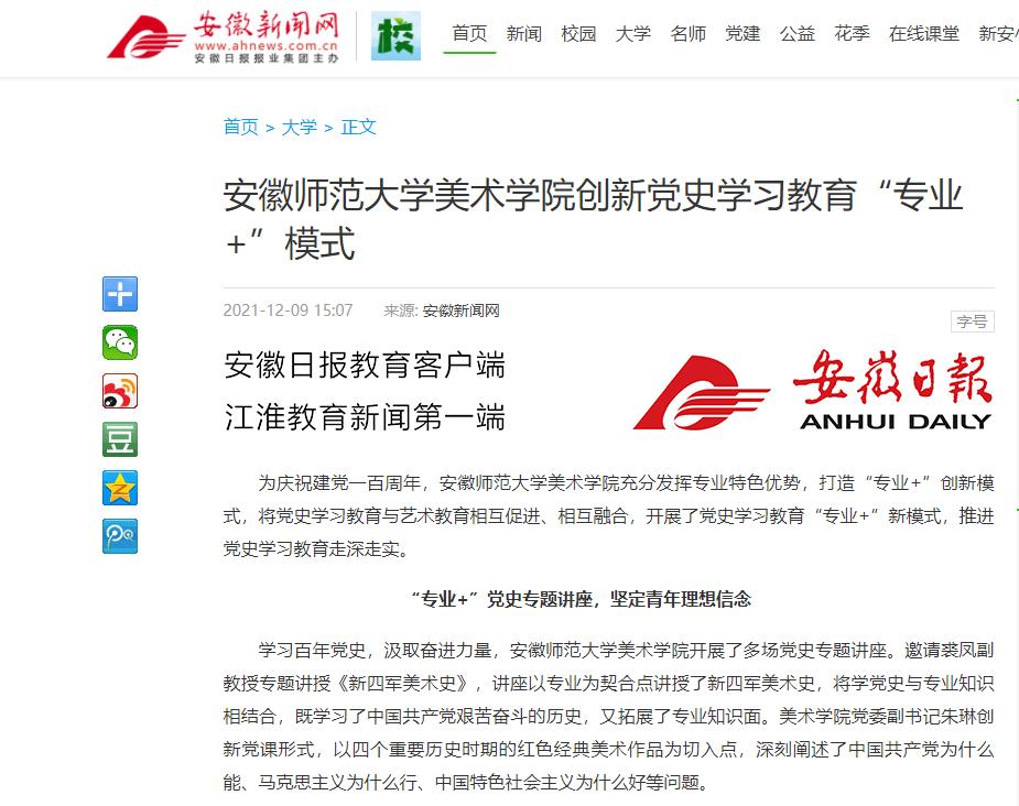 为庆祝建党一百周年,安徽师范大学美术学院充分发挥专业特色优势,打造“专业+”创新模式,将党史学习教育与艺术教育相互促进、相互融合,开展了党史学习教育“专业+”新模式,推进党史学习教育走深走实。
