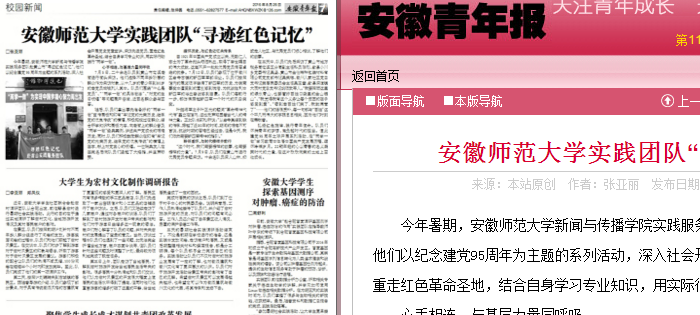 本网讯(党委宣传部)8月30日安徽青年报在校园新闻版以“安徽师范大学实践团队‘寻迹红色记忆’”为题报道了我校新闻与传播学院暑期社会实践团队事迹。全文转载如下: