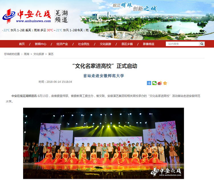 6月13日,由省委宣传部、省委教育工委主办,省文联、安徽演艺集团和相关高校承办的“文化名家进高校”活动首站走进安徽师范大学。