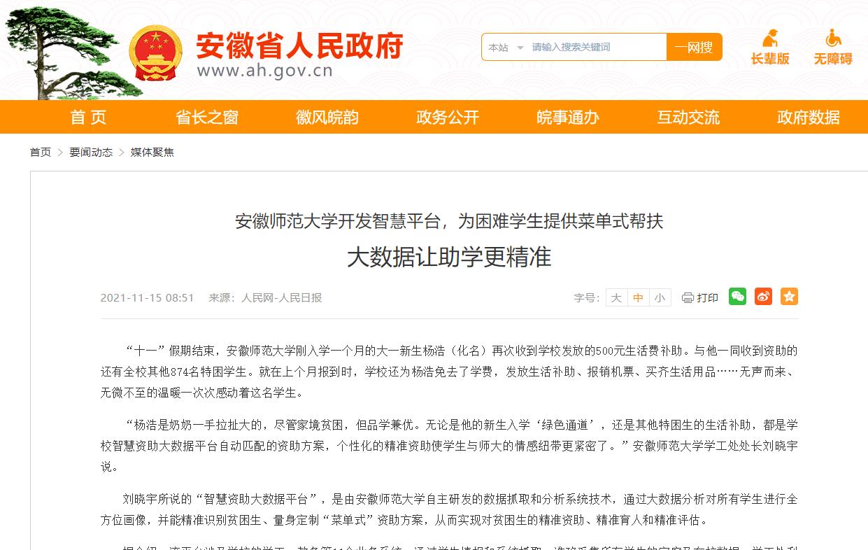 刘晓宇所说的“智慧资助大数据平台”,是由安徽师范大学自主研发的数据抓取和分析系统技术,通过大数据分析对所有学生进行全方位画像,并能精准识别贫困生、量身定制“菜单式”资助方案,从而实现对贫困生的精准资助、精准育人和精准评估。