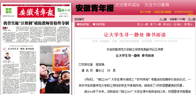 本网讯(皖江学院 刘昊) 3月23日,《安徽青年报·教育周刊》头版教育新闻栏目刊发长篇报道《让大学生寻一静处,捧书而读》,对皖江学院“皖江200”大学生课外阅读活动等文化育人工作进行了详细介绍。