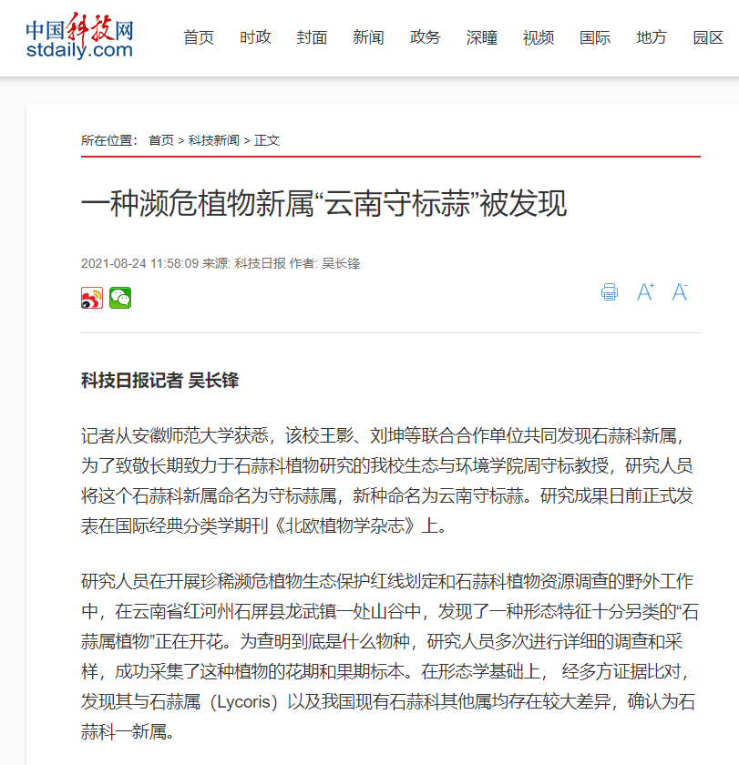 记者从安徽师范大学获悉,该校王影、刘坤等联合合作单位共同发现石蒜科新属,为了致敬长期致力于石蒜科植物研究的我校生态与环境学院周守标教授,研究人员将这个石蒜科新属命名为守标蒜属,新种命名为云南守标蒜。研究成果日前正式发表在国际经典分类学期刊《北欧植物学杂志》上。