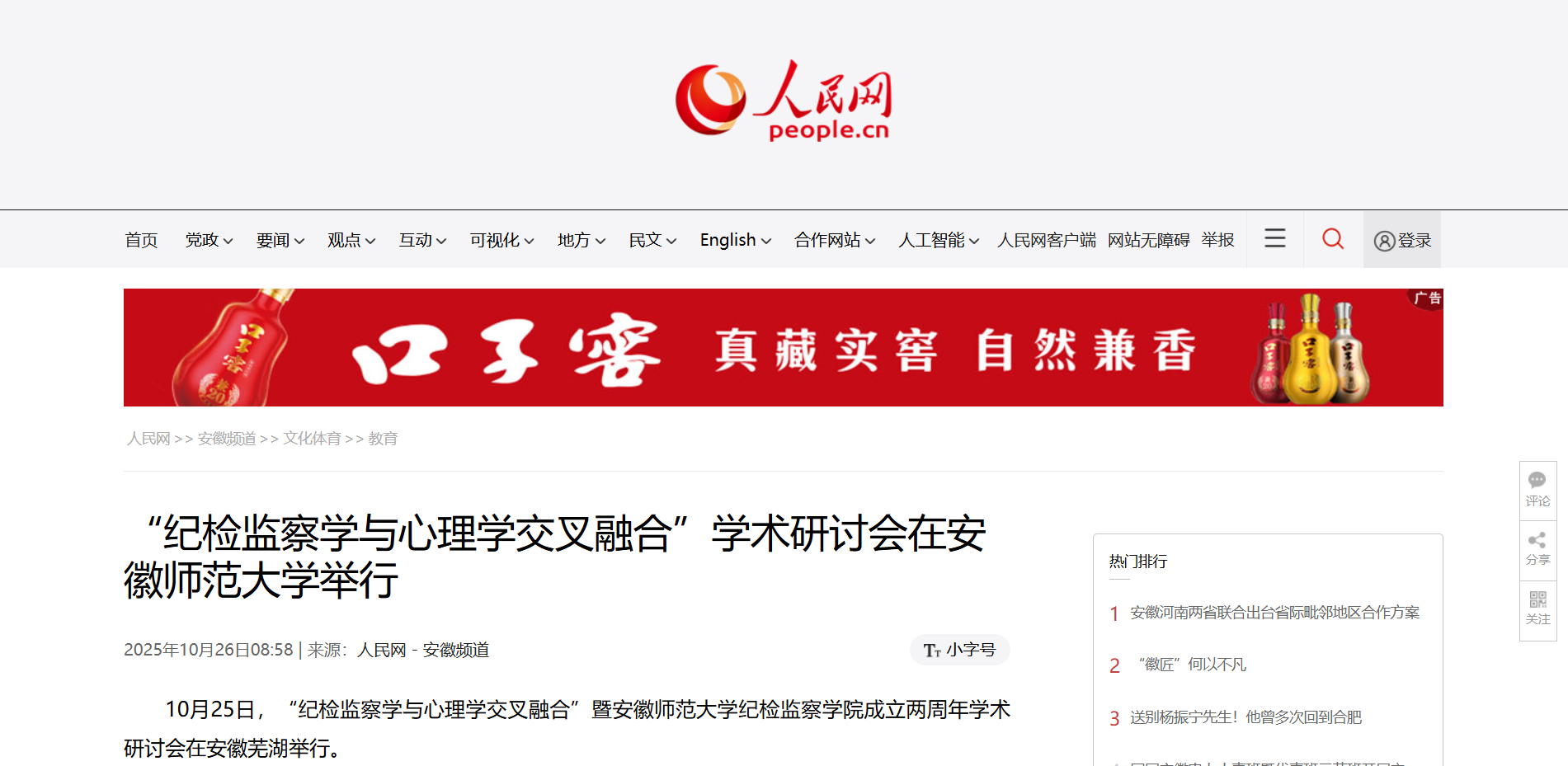 【人民网】“纪检监察学与心理学交叉融合”学术研讨会在安徽师范大学举行