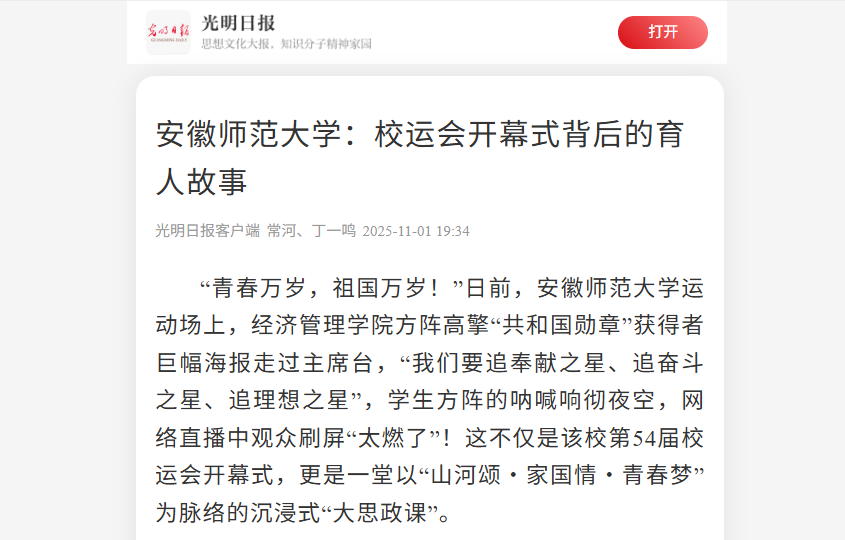 “青春万岁,祖国万岁!”日前,安徽师范大学运动场上,经济管理学院方阵高擎“共和国勋章”获得者巨幅海报走过主席台,“我们要追奉献之星、追奋斗之星、追理想之星”,学生方阵的呐喊响彻夜空,网络直播中观众刷屏“太燃了”!这不仅是该校第54届校运会开幕式,更是一堂以“山河颂・家国情・青春梦”为脉络的沉浸式“大思政课”。