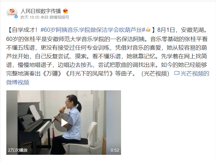 8月1日,安徽芜湖。60岁的张桂平是安徽师范大学音乐学院的一名保洁阿姨。音乐零基础的张桂平看不懂五线谱,更没有接受过任何专业训练,凭借对音乐的喜爱,她从较容易的葫芦丝开始,自己反复尝试、摸索。看不懂乐谱,她就靠记忆。先学着在网上找简谱,慢慢地唱谱子,边唱边去按孔,尝试把歌曲的调找出来。如今的她已经能够完整地演奏出《万疆》《月光下的凤尾竹》等曲子。