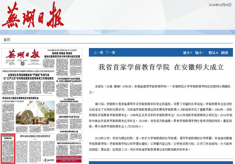 4月4日,安徽省首家学前教育学院——安徽师范大学学前教育学院在安徽师大揭牌成立。