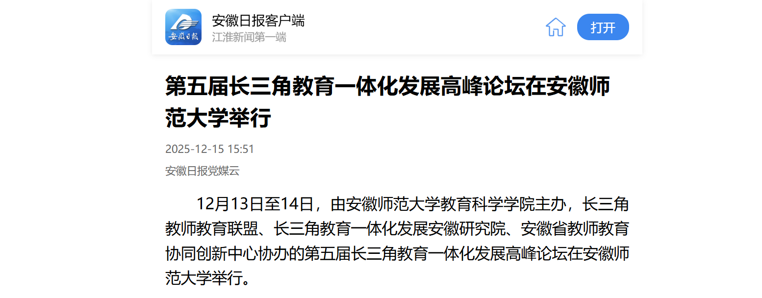 12月13日至14日,由安徽师范大学教育科学学院主办,长三角教师教育联盟、长三角教育一体化发展安徽研究院、安徽省教师教育协同创新中心协办的第五届长三角教育一体化发展高峰论坛在安徽师范大学举行。