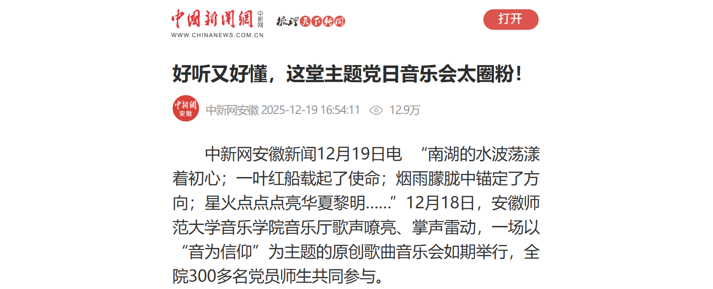 中新网安徽新闻12月19日电 “南湖的水波荡漾着初心;一叶红船载起了使命;烟雨朦胧中锚定了方向;星火点点点亮华夏黎明……”12月18日,安徽师范大学音乐学院音乐厅歌声嘹亮、掌声雷动,一场以“音为信仰”为主题的原创歌曲音乐会如期举行,全院300多名党员师生共同参与。