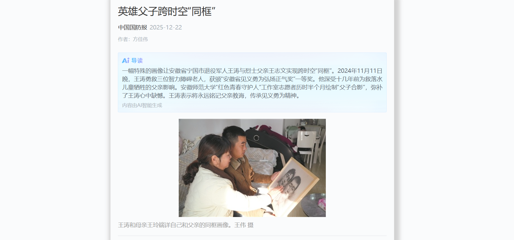 这个冬天,一幅特殊的画像,为安徽省宁国市退役军人王涛弥补了深藏心底多年的遗憾——他终于拥有了与烈士父亲王志文的“合影”。这幅跨越时空的“父子同框”画像,由安徽师范大学“红色青春守护人”工作室志愿者绘制。
