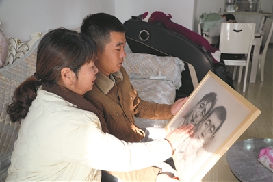 王涛和母亲王玲仔细端详自己和父亲的同框画像。王伟摄