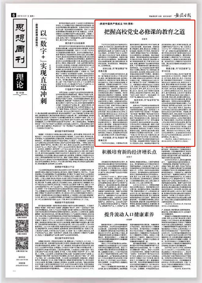 本网讯(党委宣传部)6月1日,《安徽日报》第6版理论版刊发我校党委书记胡朝荣题为《把握高校党史必修课的教育之道》的理论文章。文中从“坚持主线:用‘理论课堂’举思想之旗”“用好资源:用‘红色基因’强精神之钙”“贴近现实:用‘社会学校’拓实践之路”“尊重主体:用‘启发教育’立学习之法”等四个方面,具体阐述了强化大学生党史学习教育的重要意义和具体举措。文中强调,高校要把握好党史必修课的教育之道,坚持主题主线、用好红色资源、贴近现实生活、尊重教育主体,力求取得实效。